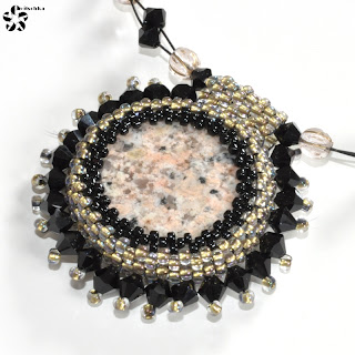 Souprava náhrdelníku a náušnic z leštěného růžového živce obšitého japonským rokailem °11 a °15 a skleněnými broušenými korálky ("sluníčka").